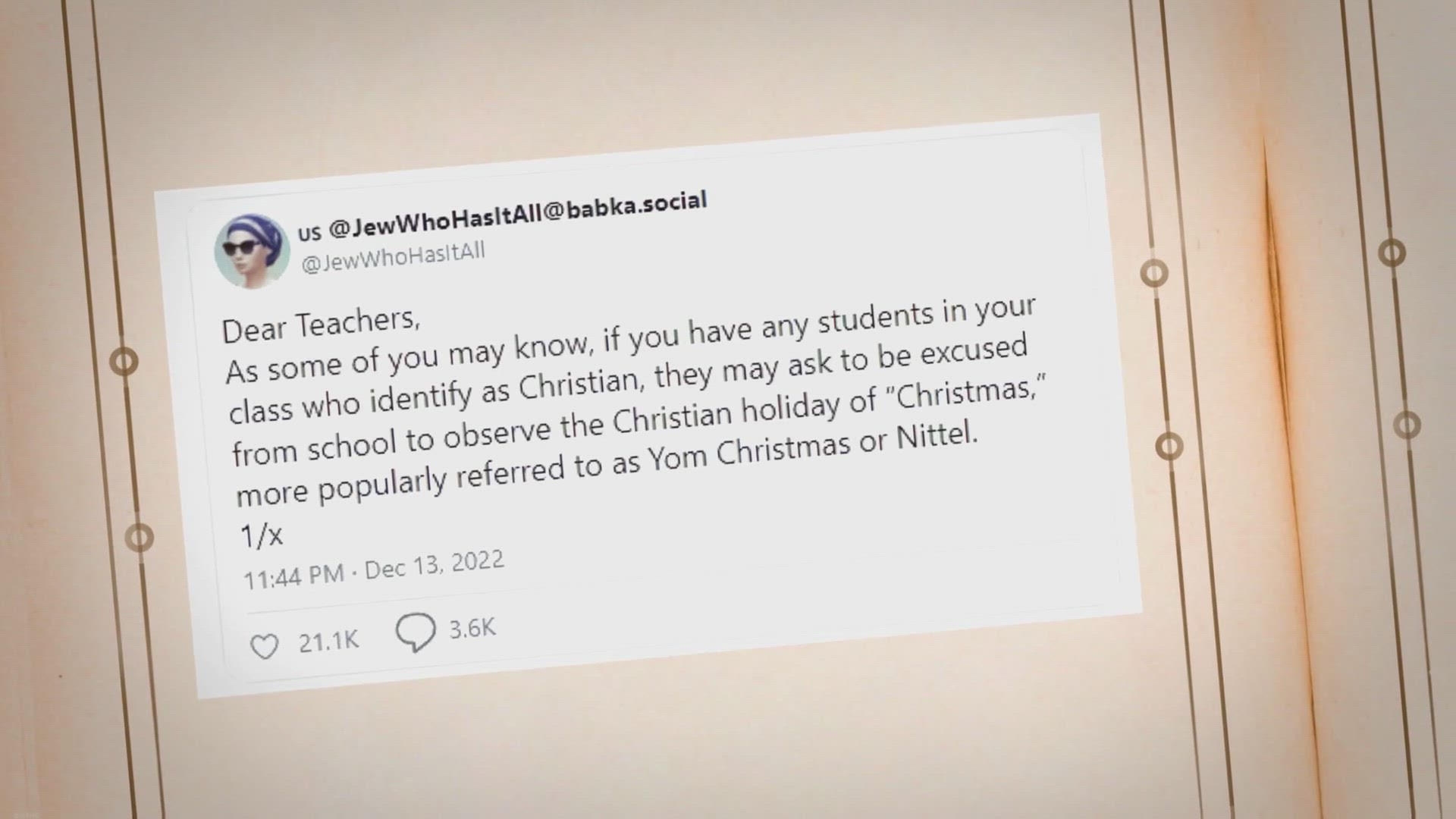 A thread by satirical account @JewWhoHasItAll features a letter to teachers about Christmas and Christian students.